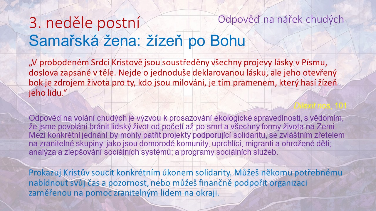 Když si příliš snadno představujeme sami sebe na místě Ježíše, riskujeme, že nám unikne pozvání evangelia. Půst od nás nežádá, abychom stáli nad ostatními jako spravedliví pomocníci. Žádá od nás, abychom stáli vedle sebe u studny, upřímní ohledně své vlastní žízně a pozorní k žízni ostatních.